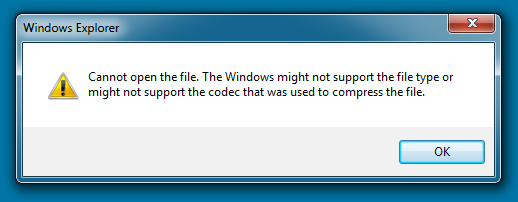- The malware caused a pop-up stating, "Cannot open the file. The Windows might not support the file type or might not support the codec that was used to compress the file."