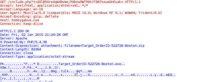 - 2015-01-02 21:24:25 UTC - hobbygabus[.]com - GET /include.php?t=20lB5S+e4qW48vWs/RXbneRWTR9tJTB67xoumOnEvak=