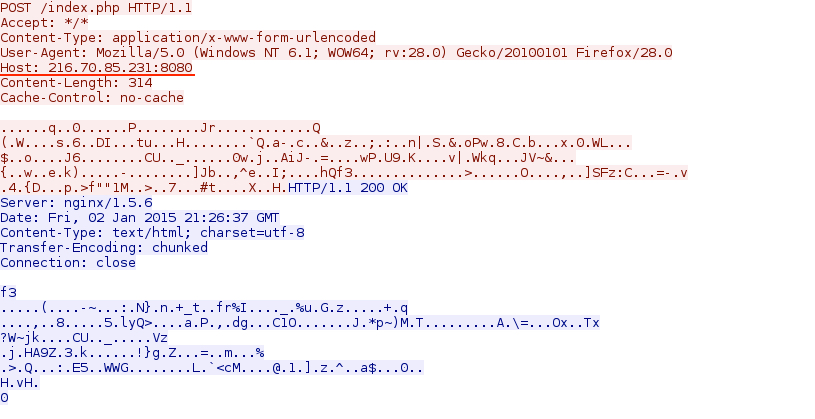 - 2015-01-02 21:26:36 UTC - 216.70.85[.]231:8080 - POST /index.php