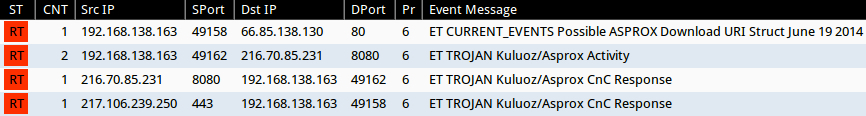 - 66.85.138[.]130:80 - ET CURRENT_EVENTS Possible ASPROX Download URI Struct June 19 2014 (sid:2018589)