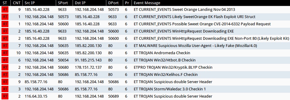 - 185.16.40[.]228:9633 - EXPLOIT-KIT Sweet Orange exploit kit outbound payload detection (sid:32640)