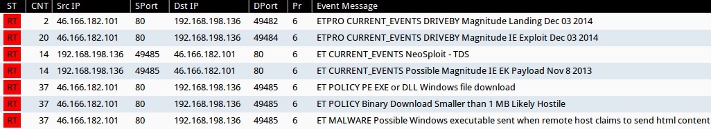 - 46.166.182[.]101 port 80 - [1:29189:1] EXPLOIT-KIT Magnitude exploit kit Microsoft Internet Explorer Payload request (x14)