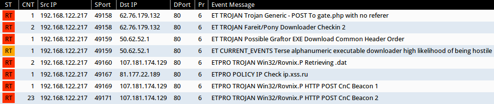 Emerging Threats and ETPRO rulesets from Sguil on Security Onion (without ET POLICY or ET INFO events):