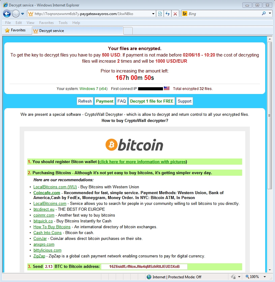 - Couldn't get a copy of CryptoWall 3.0 ransomware that I saw from the traffic after Bedep, but the bitcoin address for ransom payment was: 16Z6sidfLrfNoxJNu4qM5zhRttJEUD3XoB