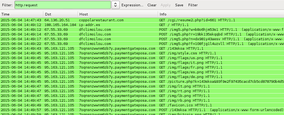 And the infected host in my lab environment quickly showed signs of a CryptoWall 3.0 ransomware infection. The bitcoin address for the ransom payment was: 16REtGSobiQZoprFnXZBR2mSWvRyUSJ3ag. A quick check on blockchain[.]info showed 2 transaction on this bitcoin account from April and May of 2015.