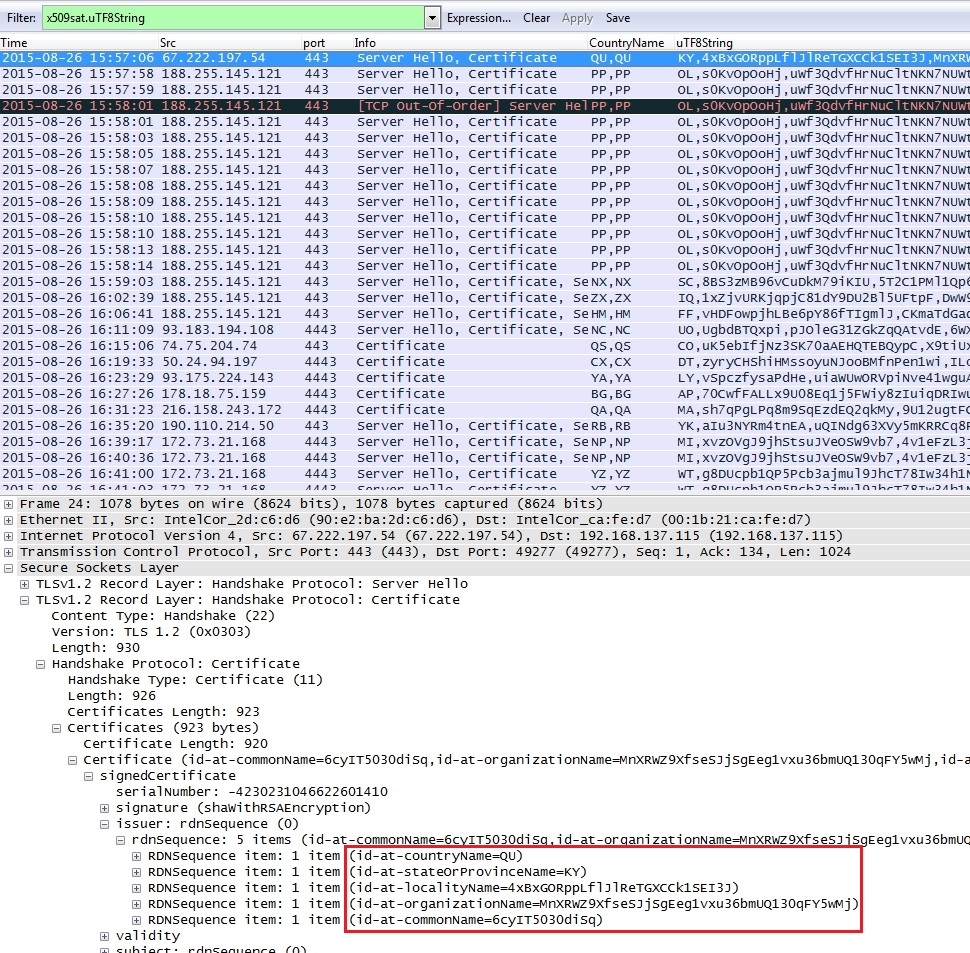 Shown below: Some filtering and altered column displays in Wireshark to show certificate data in the Dyre traffic.