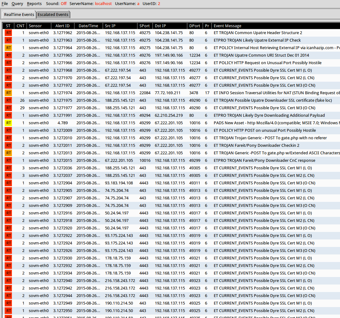 Shown below: Sguil in Security Onion using Suricata and the ET and ET Pro rulesets. I used tcpreplay and got tired of waiting for the pcap to finish.