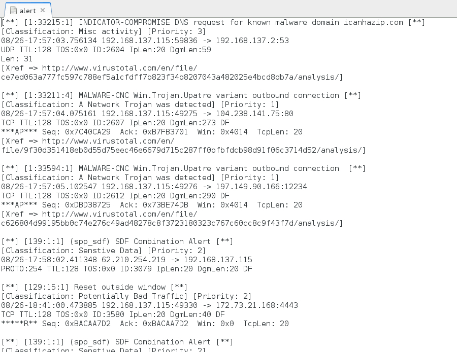 Shown below: Alerts from the Snort registered ruleset using Snort 2.9.7.5. This is from the /var/log/snort/alert file.