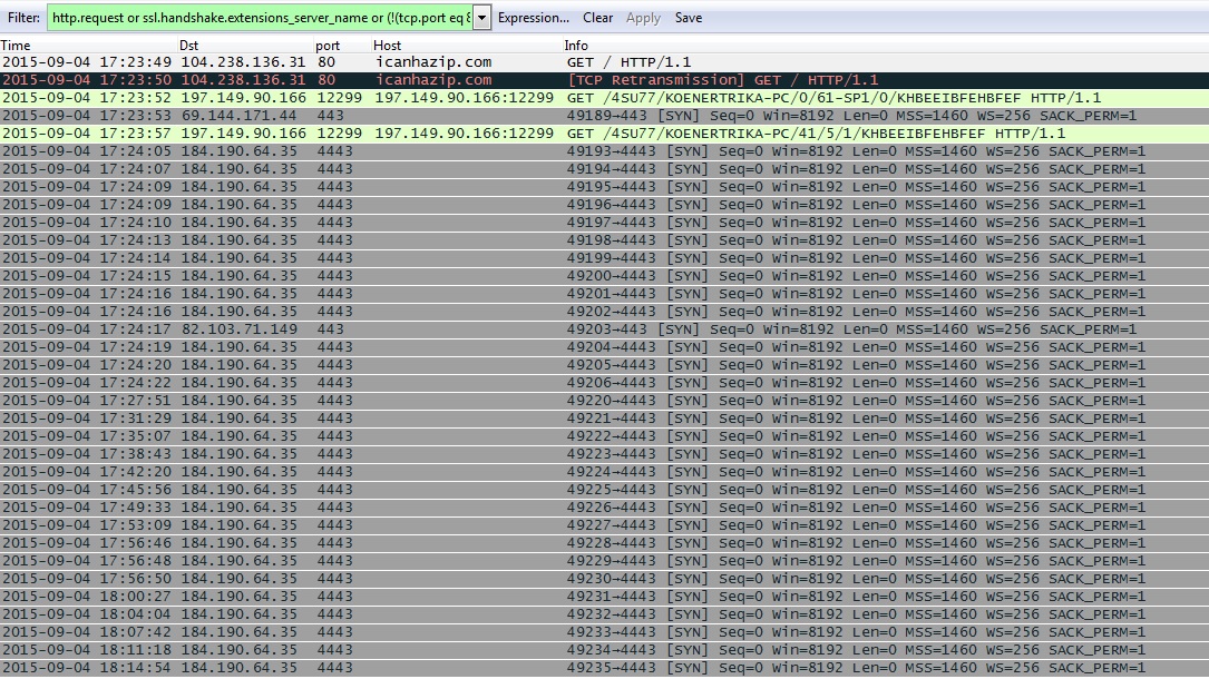 - 2015-09-04 17:24:05 UTC - 184.190.64[.]35 port 4443 (https) - Encrypted traffic, periodic TCP connections