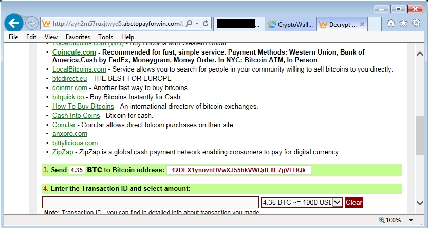 - Bitcoin address for this CryptoWall 3.0 sample's ransom payment was: 12DEX1ynovnDVwXJ55hkVWQdE8E7gVFHQk