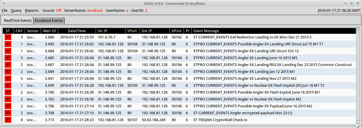 - 31.148.99[.]125 port 80 - [1:36635:3] EXPLOIT-KIT Angler exploit kit search uri request attempt