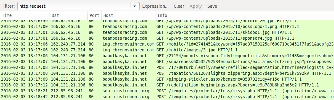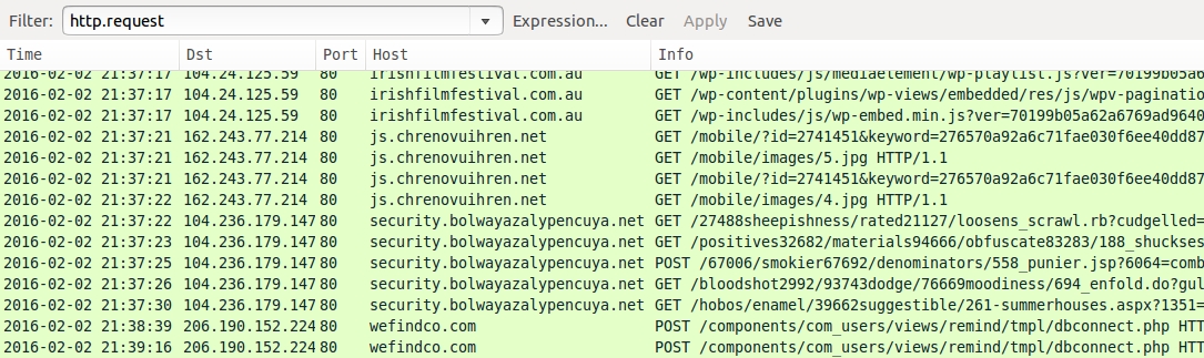 Shown above: Traffic from my 2016-02-02 infection filtered in Wireshark.