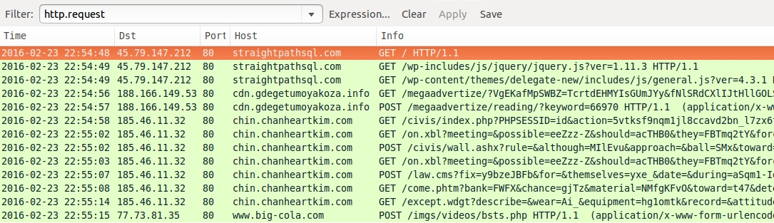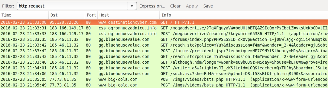 Shown above: Traffic from the first pcap filtered in Wireshark.