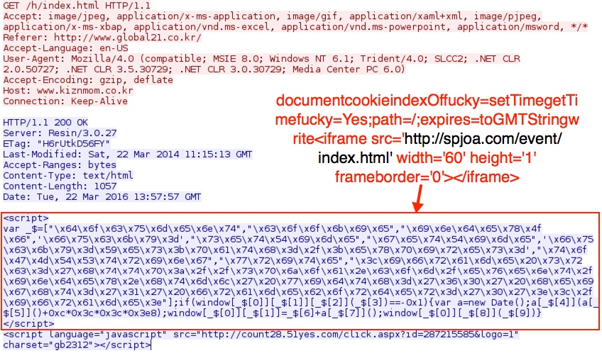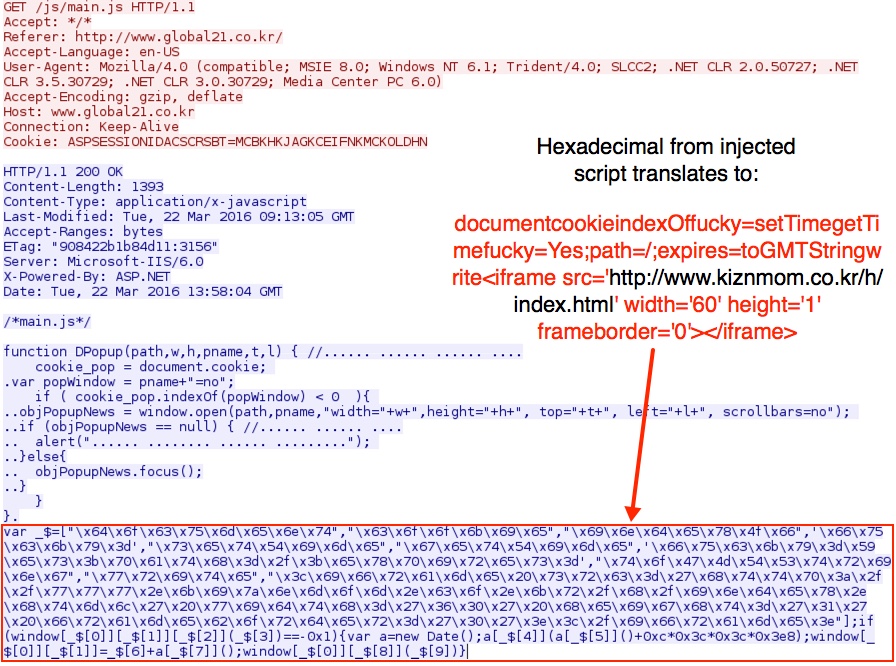 - www.global21[.]co[.]kr - GET /js/main.js [Text returned from compromised site with injected script]
