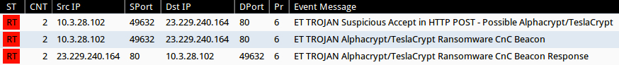 Shown above: Emerging Threats signatures triggered for TeslaCrypt ransomware on the post-infection traffic.