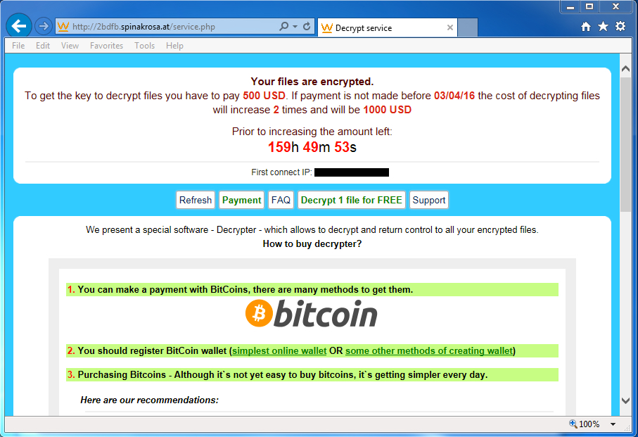 Shown above: Final page to make your bitcoin payment for the ransom.