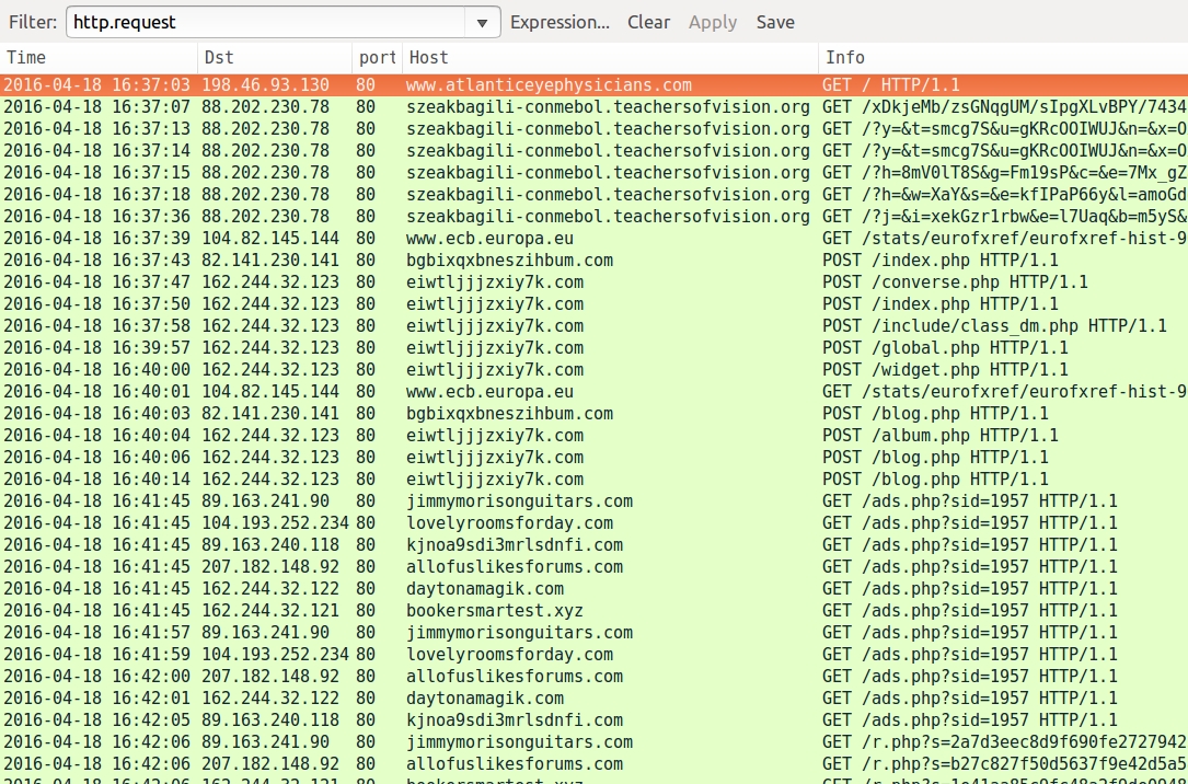 Shown above: Pcap of the pseudo-Darkleech Angler EK infection traffic filtered in Wireshark.