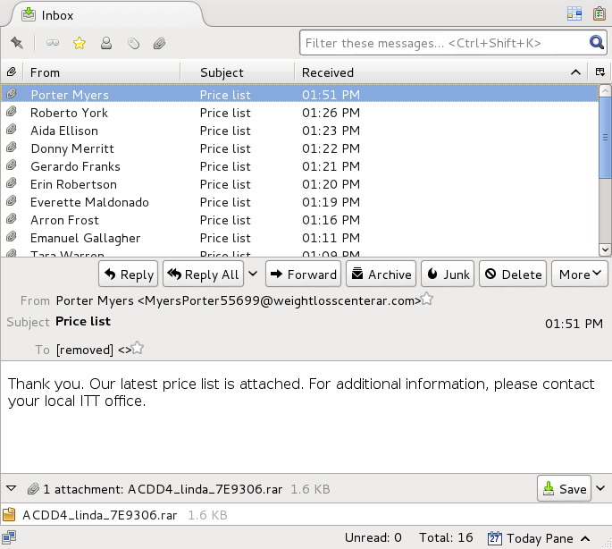 Shown above: Data on 16 of emails from this wave of emails pushing Locky ransomware.