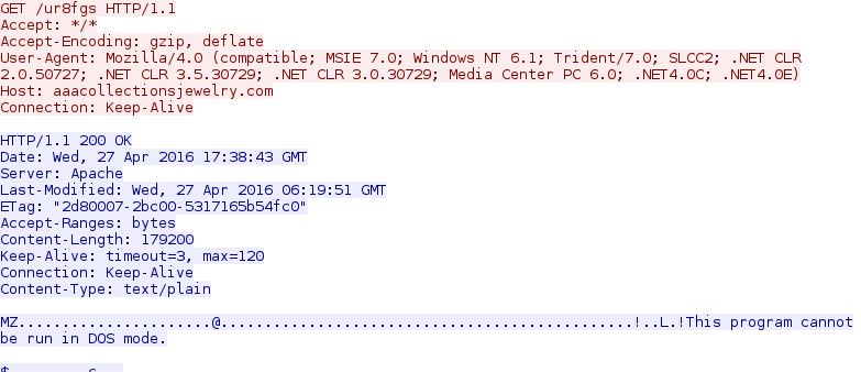 - 2016-04-27 17:38:43 UTC - 50.6.80[.]160 port 80 - aaacollectionsjewelry[.]com GET /ur8fgs