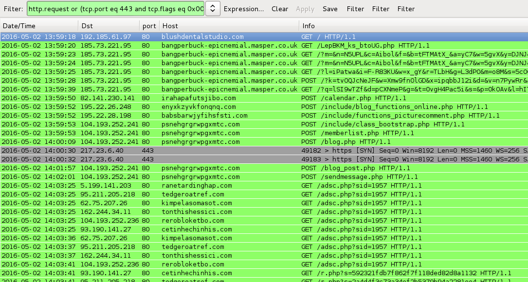 Shown above: Pcap of the traffic filtered in Wireshark. http.request or (tcp.port eq 443 and tcp.flags eq 0x0002)