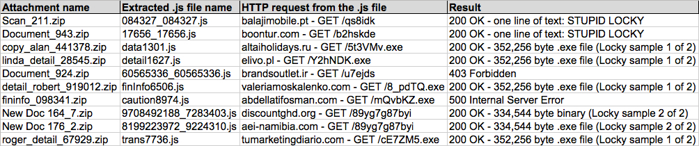 Shown above: Data from the .csv spreadsheet on 10 attachments from today's Locky ransomware.