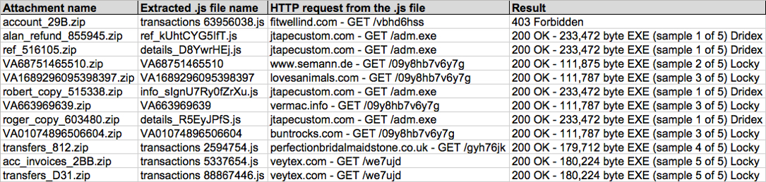 The Palo Alto Networks Unit 42 blog about Locky ransomware can be found here, and Proofpoint's blog about Dridex actors sending Locky ransomware is available here.