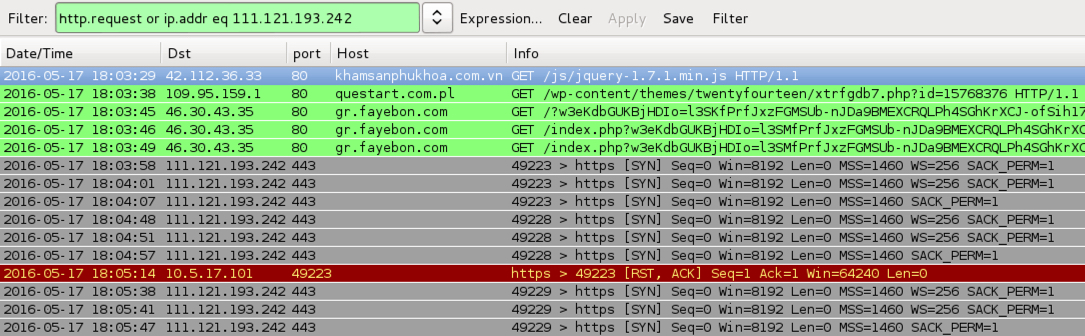 - 111.121.193[.]242 port 443 - attempted TCP connections from the infected host. [RST by the server]