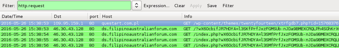 Shown above: Pcap of the 2016-05-26 traffic filtered in Wireshark.