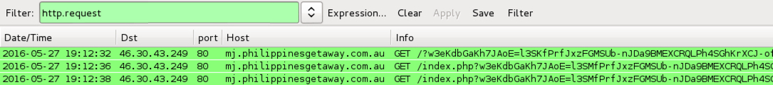 Shown above: Pcap of the 2016-05-27 traffic (second run) filtered in Wireshark.