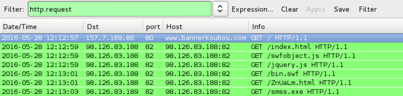 Shown above: Traffic carved from the 2016-05-28 Threatglass pcap filtered in Wireshark.