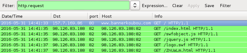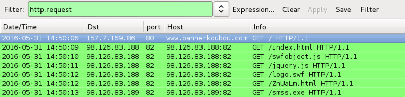 Shown above: Traffic from the 2016-05-31 second run (infection) filtered in Wireshark.