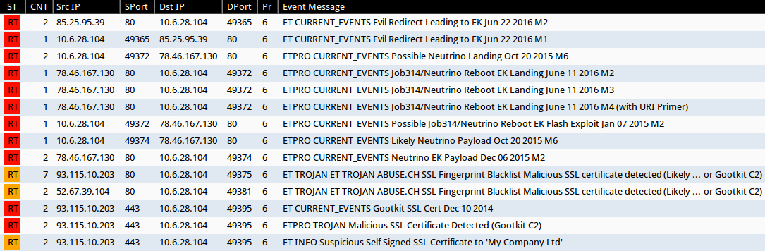 Shown above: Alerts in Sguil after using tcpreplay on the fourth pcap in Security Onion with Suricata and the EmergingThreats Pro ruleset.