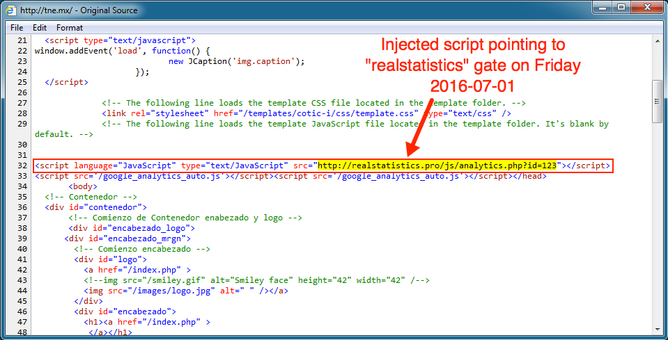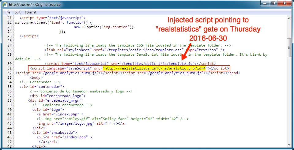 Shown above: Injected script pointing to the "realstatistics" gate from a compromised website yesterday.