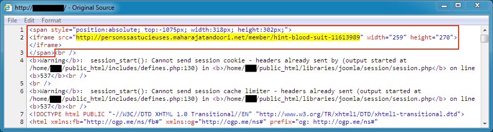 Shown above: Injected pseudoDarkleech script in a page from a second compromised site.