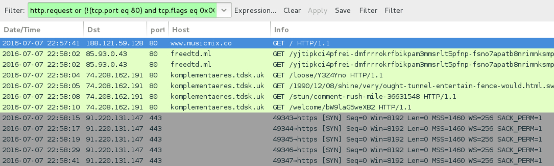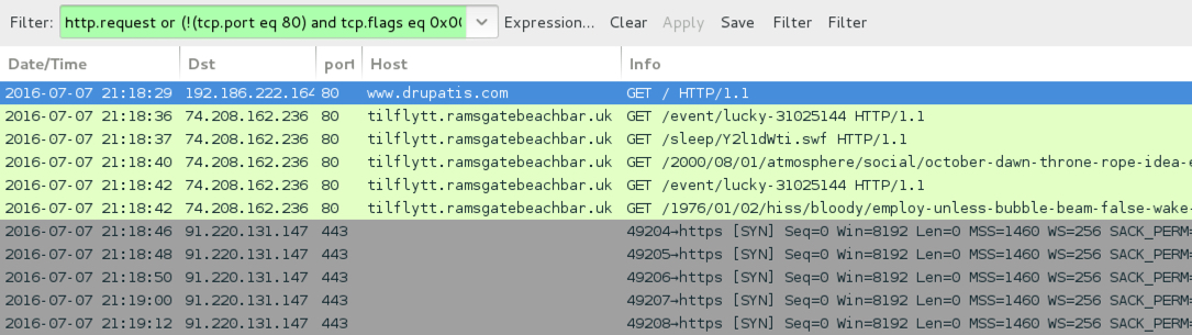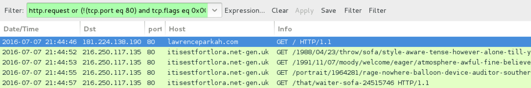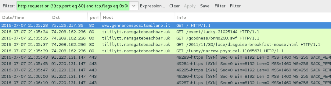 Shown above: Traffic from the first pcap filtered in Wireshark. Filter: http.request or (!(tcp.port eq 80) and tcp.flags eq 0x0002)