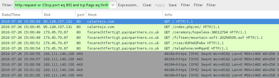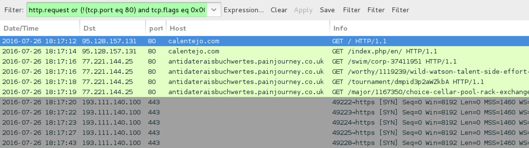 Shown above: Traffic from the second pcap filtered in Wireshark. Wireshark filter: http.request or (!(tcp.port eq 80) and tcp.flags eq 0x0002)