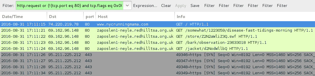 Shown above: Traffic from the pcap filtered in Wireshark. Wireshark filter: http.request or (!(tcp.port eq 80) and tcp.flags eq 0x0002)