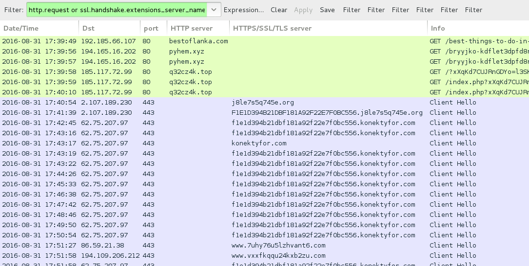 Shown above: Traffic from the pcap filtered in Wireshark (shows post-infection and Tor traffic).