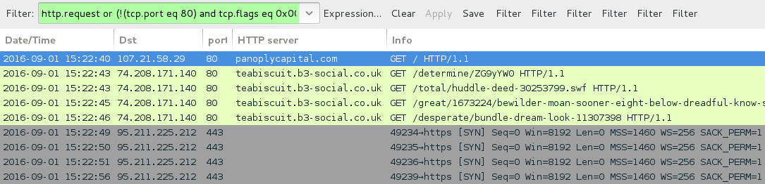 Shown above: Traffic from the pcap filtered in Wireshark. Wireshark filter: http.request or (!(tcp.port eq 80) and tcp.flags eq 0x0002)