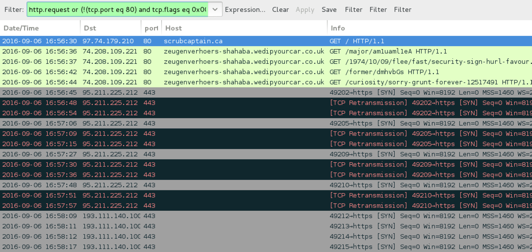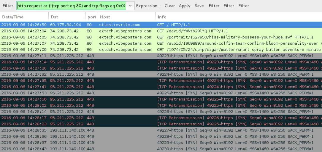 Shown above: Traffic from the first pcap filtered in Wireshark. Wireshark filter: http.request or (!(tcp.port eq 80) and tcp.flags eq 0x0002)