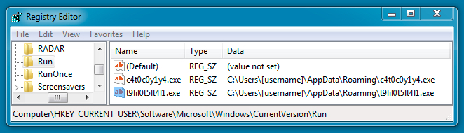 Shown above: Some ofregistry entries to ensure the malware stayed persistent after a reboot.