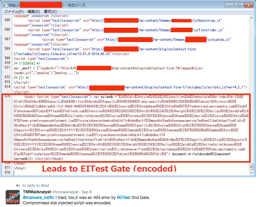 Shown above: Tweet from @tmmalanalyst on Thursday 2016-09-08 showing some obfuscation in the injected EITest script.