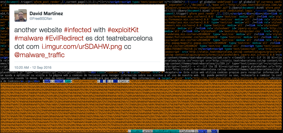 Shown above: Tweet from @FreeBSDfan on Monday 2016-09-12 (today) with Pastebin link to image showing further obfuscation of the injected EITest traffic.